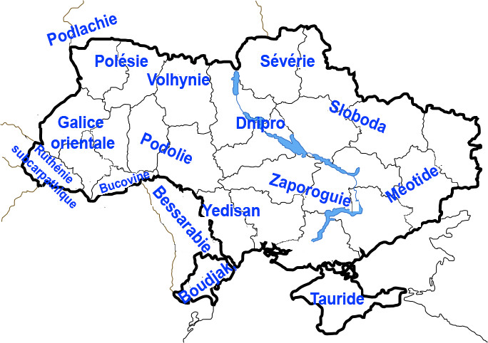 À ce stade de l’histoire, l’Ukraine est en fait formée de trois régions en raison de leurs différentes influences culturelles suivant les fluctuations territoriales au cours de l’histoire. L’ouest et principalement la Galicie a été tout d’abord annexée par la Pologne et la Lituanie puis par l’Autriche, rattachées à l’Église catholique. L’influence autrichienne fut importante quant à la gestion administrative de la production et du commerce, qui permit l’enrichissement de certaines villes et notamment Lviv où résidait l’administration centrale, avec en plus le développement de l’industrie pétrolière en Galicie orientale. Le centre, autour de Kiev, multi ethnique, a reçu les influences successives de la Lituanie, de la Pologne, des Cosaques zaporogues et enfin de la Russie. L’essor industriel et commercial autour de Kiev contribuent encore à accroitre le rôle de Kiev en tant que centre industriel, commercial et administratif, ce qui par l’arrivée d’une importante population russe, impose la russification de cette région. Enfin, la partie sud et est a connu des influences différentes, d’abord des Tatars, puis des Cosaques du Don et enfin de l’empire russe. L’exploitation de la houille et du sel gemme dès le début du xxe siècle provoqua une forte arrivée de colons russes (près de 30 % de la population du Donbass) se mêlant aux Grecs, aux juifs, aux Allemands et aux Tatars (entre 20 et 30 % de la population) et au reste d’Ukrainiens.